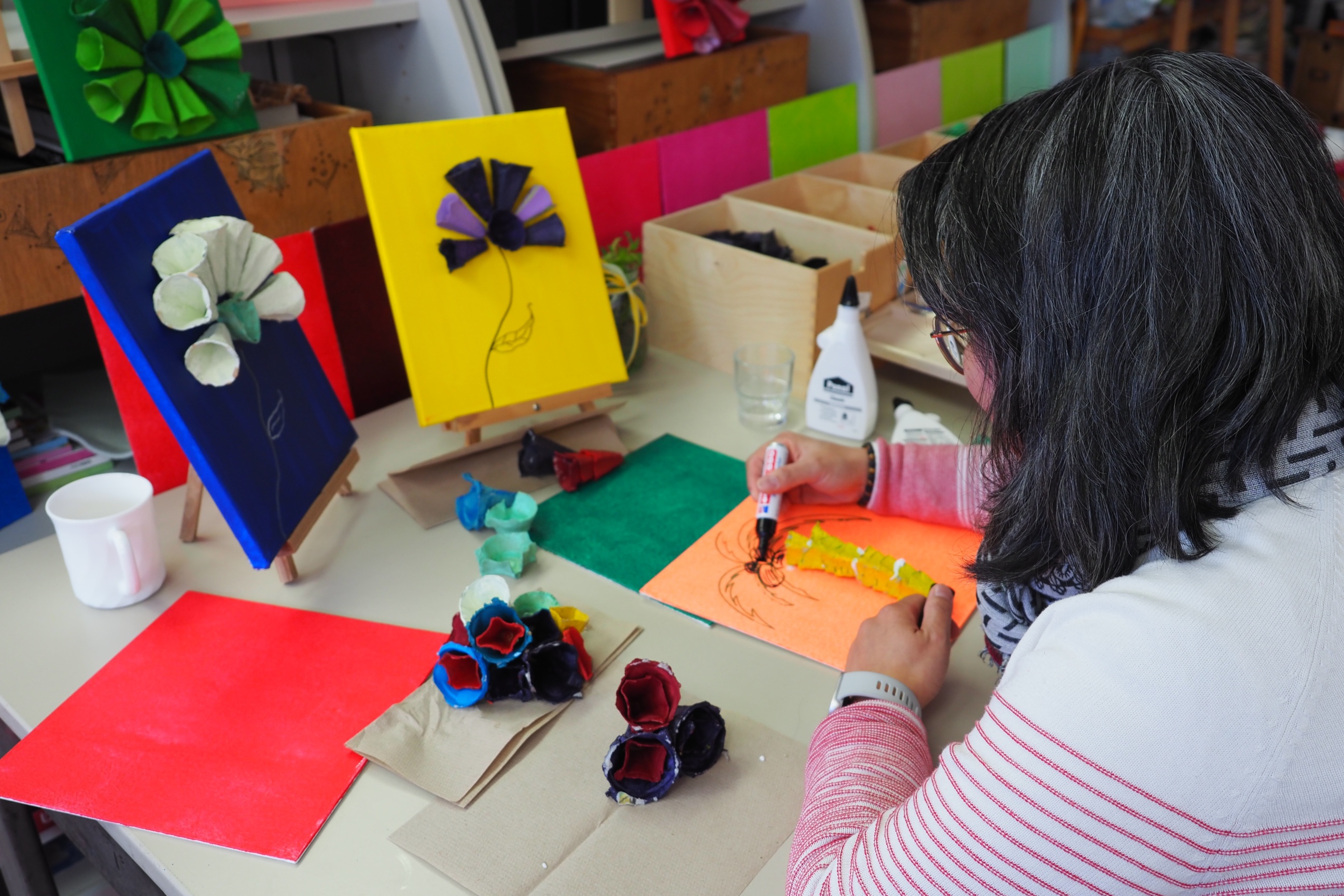 Die Besucher und Besucherinnen des Ateliers „Bunte Reiter“ unter Leitung von Elmira Wilms hatten die unterschiedlichsten Objekte aus recycelten Eierkartons hergestellt: Zwerge und Hühner, Feen und Mobiles, Bilder und Tulpen.