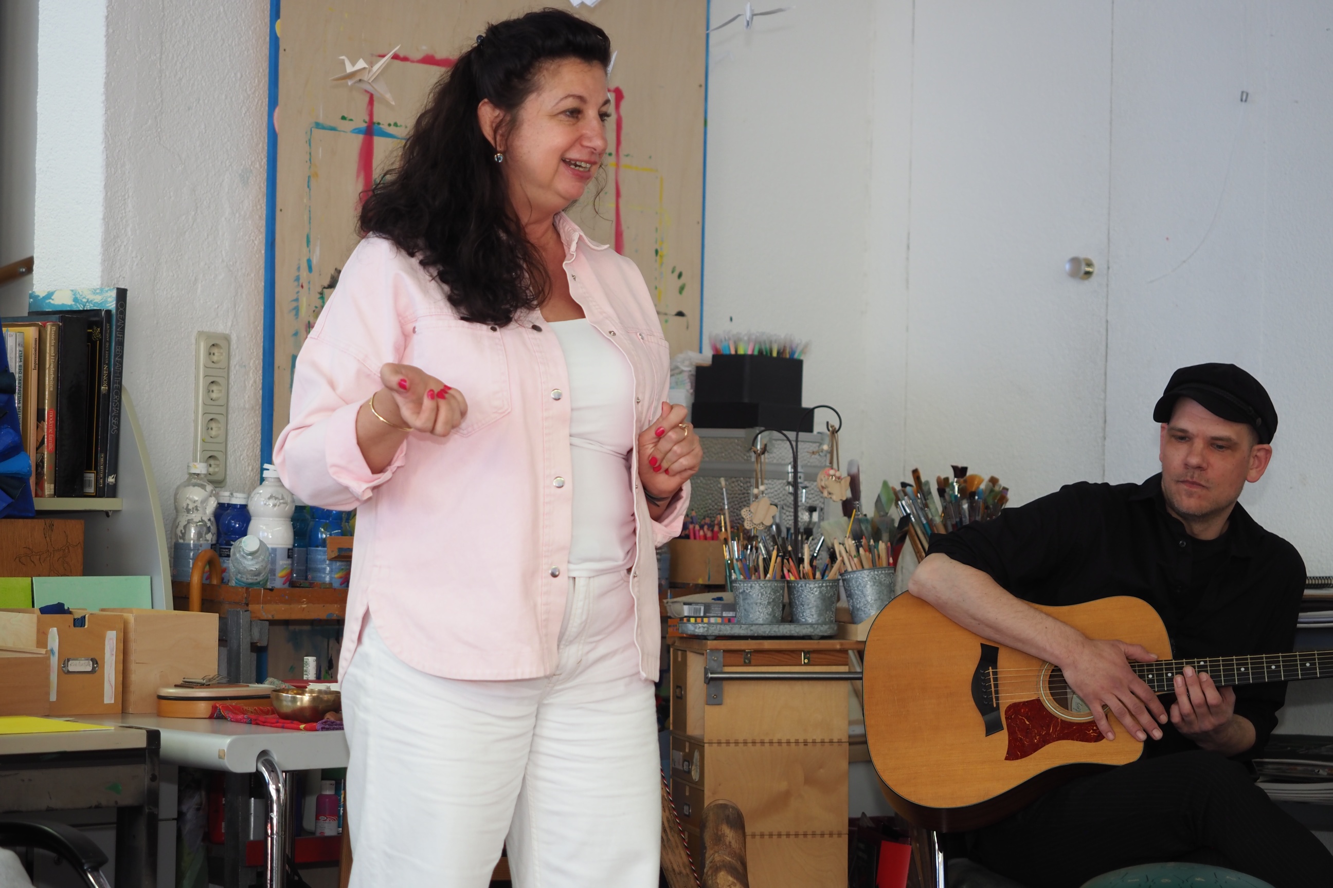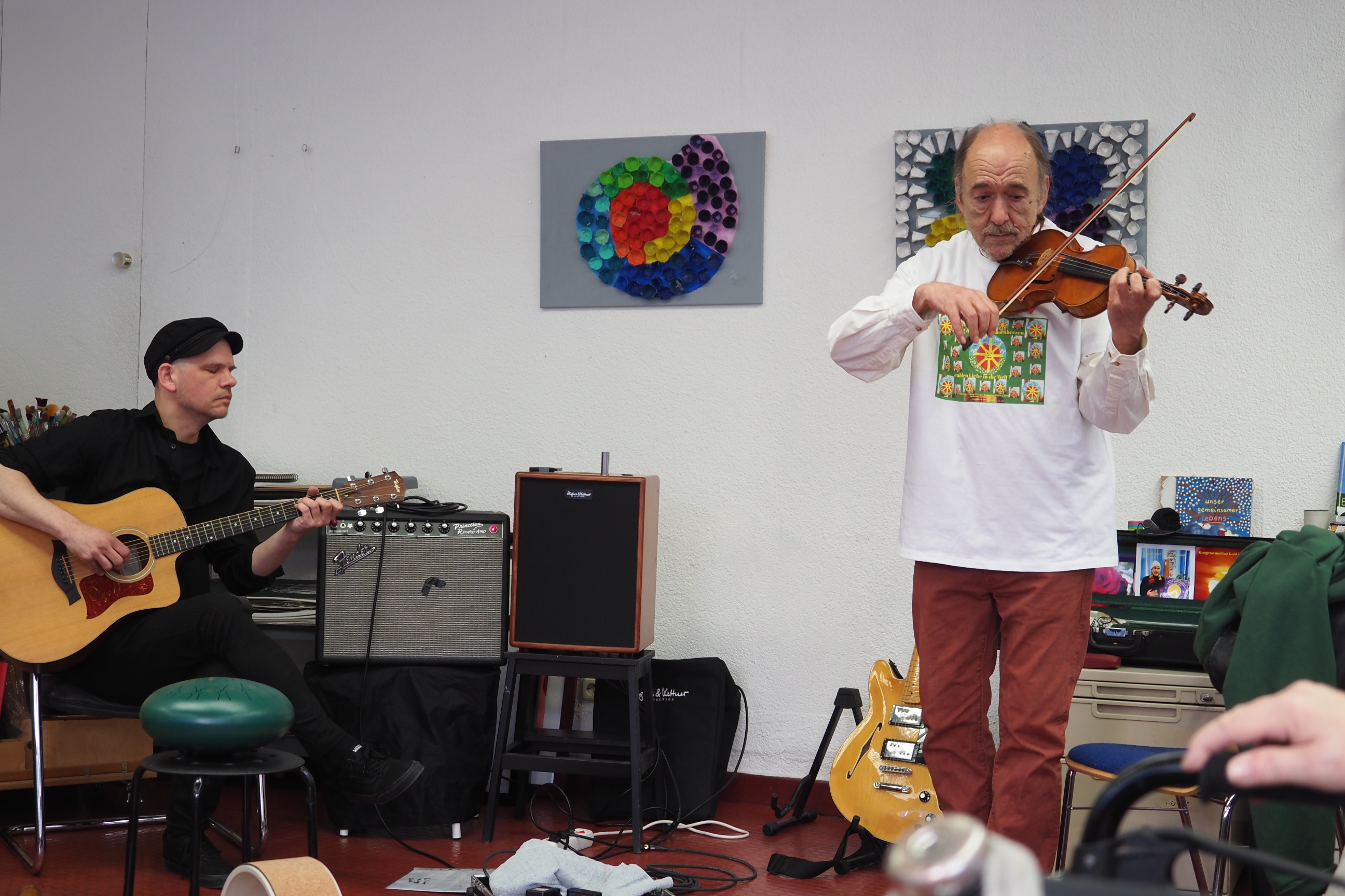 Auch der regelmäßige Atelierbesucher Theodor Buck hatte seine Geige mitgebracht, eine eigene Strophe zum schönen Volkslied „Weißt du, wieviel Sternlein stehen“ gedichtet und sang sie mit dem Publikum. Er las auch sein Lieblingsgedicht von Rainer Maria Rilke vor und präsentierte sein Lebensmotto, „Sonne im Herzen“, das er auch immer wieder malt und sogar für diese Gelegenheit ein entsprechendes T-Shirt angezogen hatte.