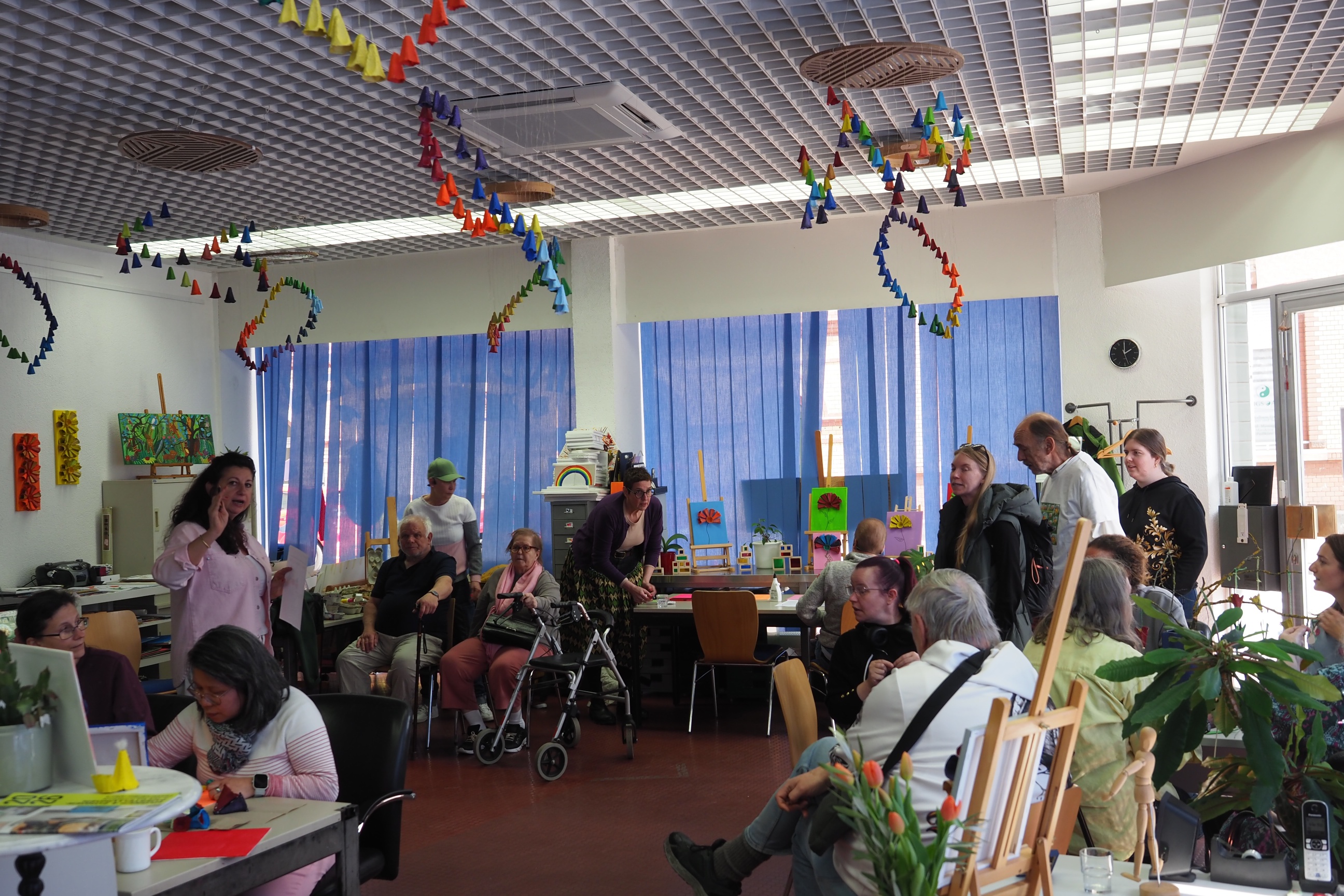 Diese konnten bei der Veranstaltung auch nochmal gebastelt werden. Sie dekorieren jetzt den Atelier-Raum in allen Regenbogenfarben. „Jedes einzelne steht für Lebensfreude, Vielfalt und seelische Gesundheit“, sagte Elmira Wilms. Indem man künstlerischen Ausdruck verwirkliche, könne man vielleicht auch dem Körper helfen, seinen Ausdruck so zu finden – anstelle von Krankheitssymptomen. Auf jeden Fall haben die Künstlerinnen und Künstler viel Spaß bei der gemeinsamen Arbeit im Atelier, das zum Psychosozialen Zentrum Süd gehört.